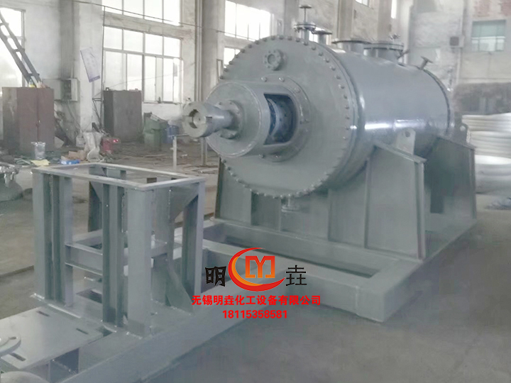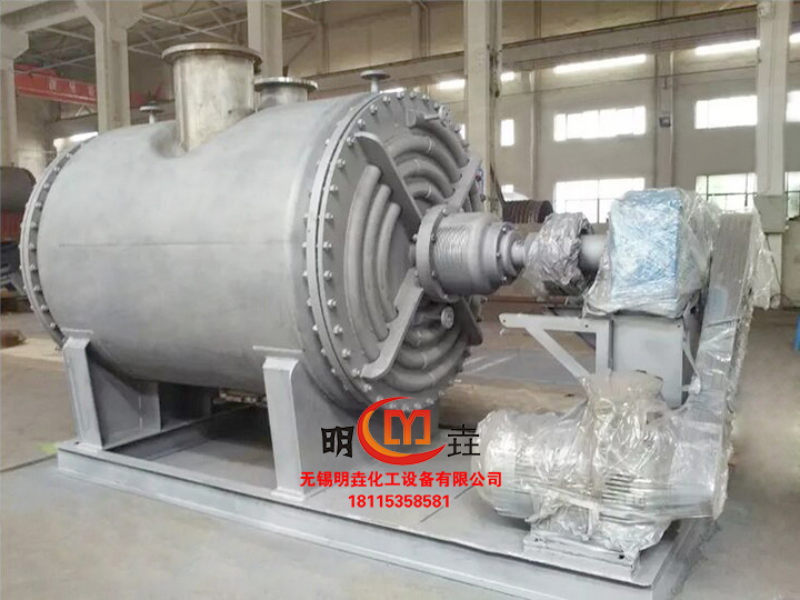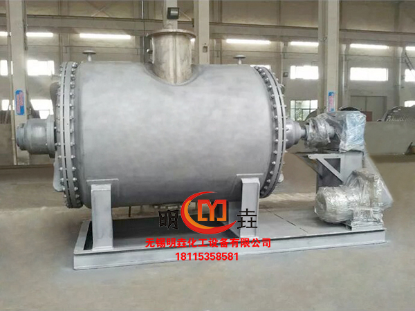 被干燥物料從殼體上方正中間加入,在不斷正反轉動的耙齒的攪拌下,物料軸向來回走動,與殼體內壁接觸的表面不斷變新,受到蒸汽的間接加熱,耙齒的均勻攪拌,粉碎棒的粉碎,使物料內的水份氣化,在真空系統的作用下,使被干燥物料內部水份和表面水份有利的排出,氣化的水份經干式除塵器、濕式除塵器、冷凝器,從真空泵出口處放空。